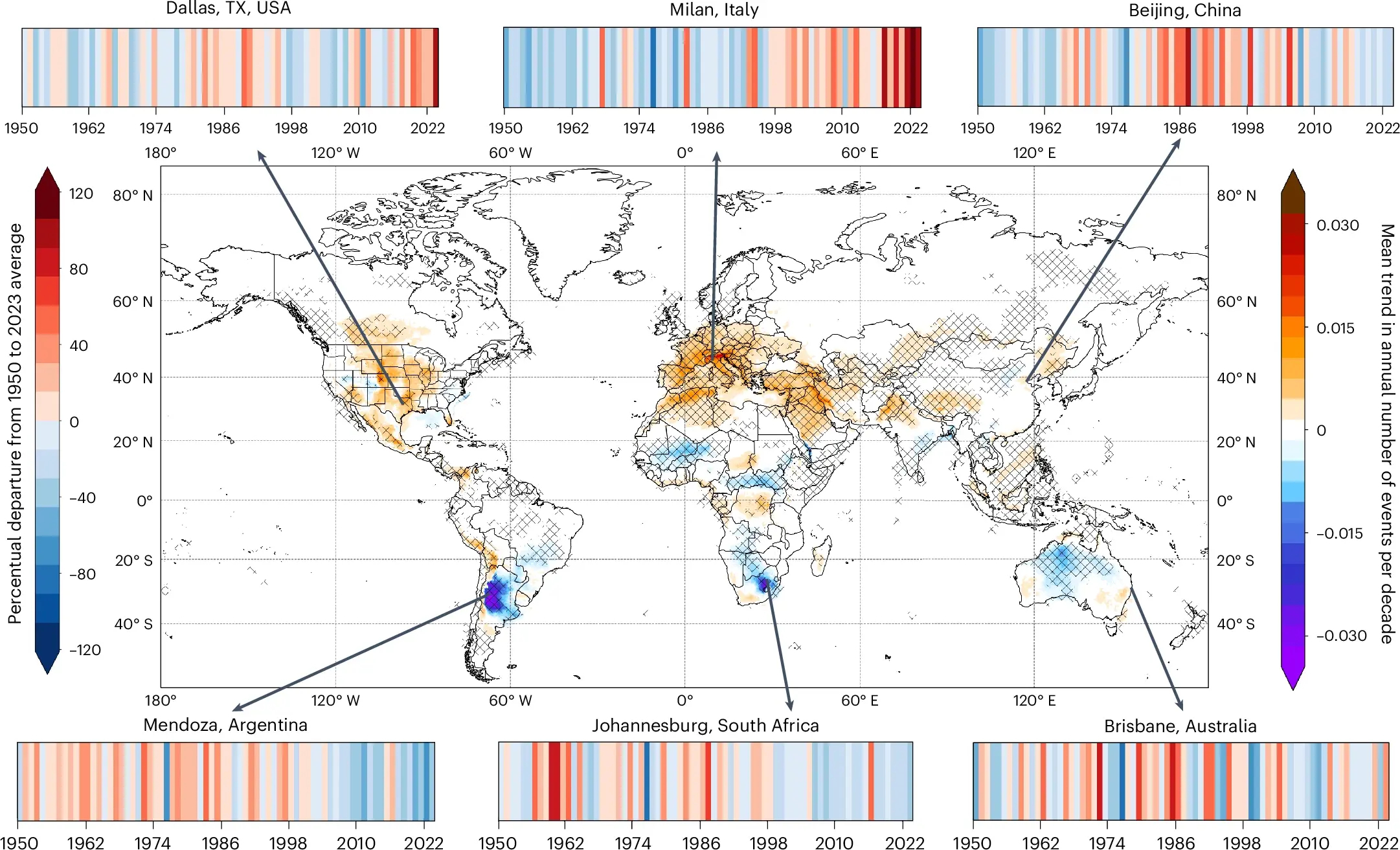 Mean trend in the annual number of very large hail events per decade between 1950 and 2023. Hail stripes showing the yearly occurrence of very large hail are provided for six metropolitan regions. From: Battaglioli, F., Taszarek, M., Groenemeijer, P. et al. Contrasting trends in very large hail events and related economic losses across the globe. Nat. Geosci. 19, 52–58 (2026). https://doi.org/10.1038/s41561-025-01868-0